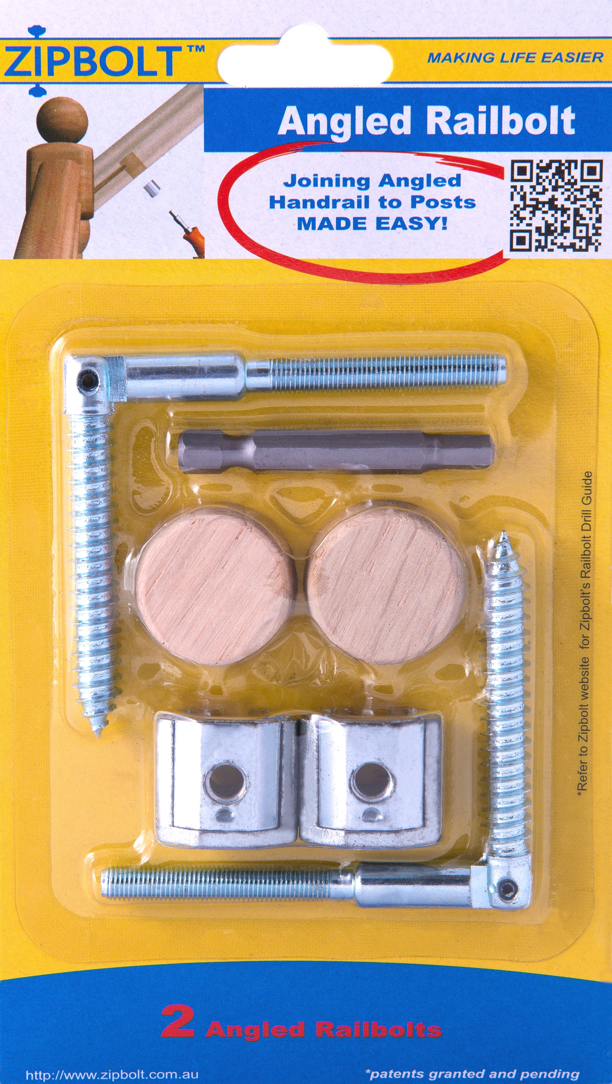 The Zipbolt Angled Railbolt (11.550) , primarily designed for the stair industry to solve the problem of secretly attaching the hand rail at an angle to a newel post. It produces a strong joint without the unsightly long screw going through the visible face of the newel post or ugly filled nail holes.
